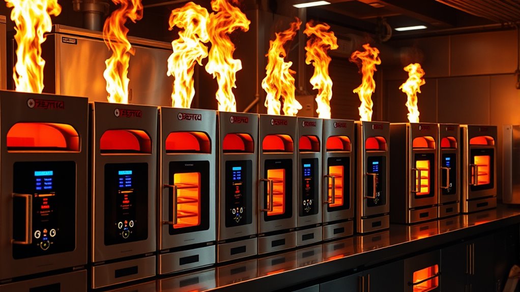 Yes, there are safety features specific to extreme heat ovens. I always look for automatic shut-off systems that activate if the oven overheats, along with thermal sensors that monitor temperature constantly. Additionally, insulated doors prevent accidental burns, and sturdy handles stay cool to the touch. These safety measures help me cook confidently, knowing I’m protected from high-temperature hazards while maintaining ideal performance.
