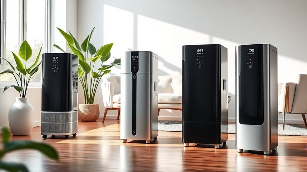 If you’re searching for the best high-end air purifiers for allergies in 2025, I recommend models with advanced HEPA filtration capable of covering large rooms up to 3,620 sq. ft. Features like washable filters, quiet operation, smart controls, and certifications guarantee they actually improve air quality. These units effectively capture 99.97% of airborne pollutants, including allergens and dust, and offer customizable settings for comfort. Continue exploring to find the perfect fit for your needs and breathe easier.