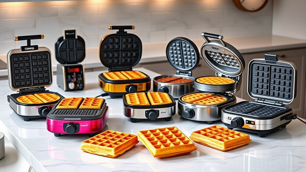 Based on my research, the 15 best waffle makers of 2025 combine durability, versatility, and delicious results. Top models like the GreenPan Elite and Ninja NeverStick PRO offer high-quality nonstick coatings, adjustable browning, and even heating for perfect waffles. Compact options like the DASH Mini Maker are ideal for small spaces, while multi-function devices add extra cooking possibilities. Keep exploring to discover which waffle maker fits your needs and helps create amazing breakfast treats effortlessly.