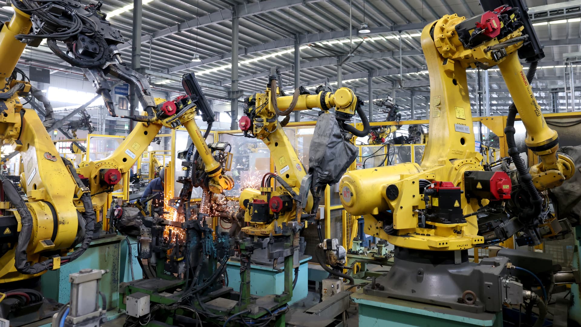 Robots manufacture auto parts at a factory in Ningde, China, on Oct. 17, 2024.