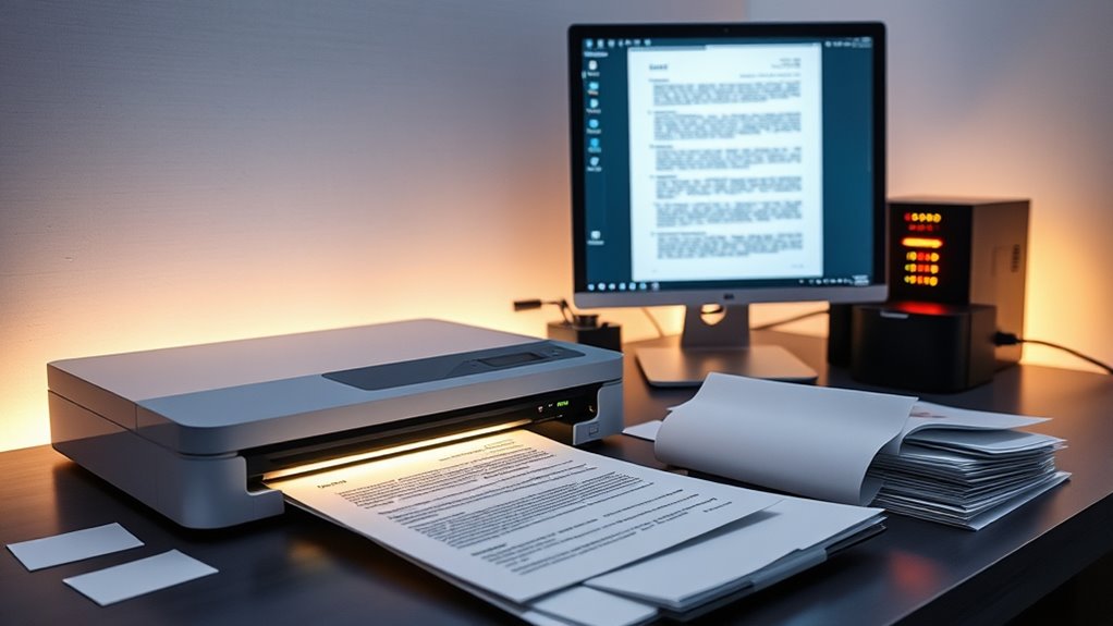 To go paperless with scanning, OCR, and secure storage, you can digitize all documents using high-quality scanners and AI-driven OCR technology that accurately captures data and categorizes files automatically. Secure cloud storage with encryption, access controls, and regular backups helps protect sensitive information. This progression reduces paper costs, speeds up workflows, and boosts compliance. If you want to explore how these tools work together seamlessly, there’s much more to discover below.