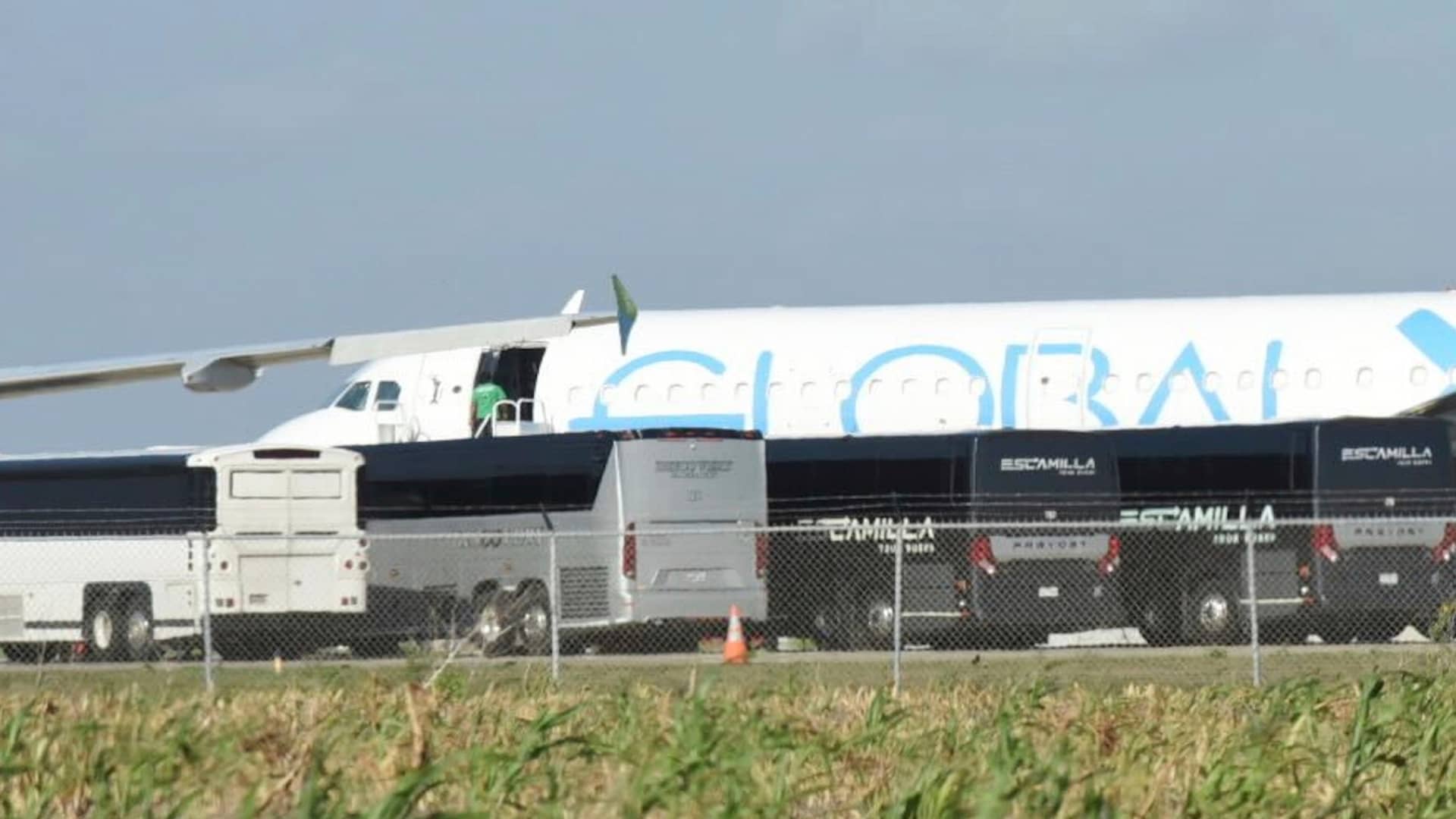 A person boards a plane in Harlingen, Texas Sunday, Aug. 31, 2025, as four charter buses are pulled into the side of the airport to unload dozens of passengers.