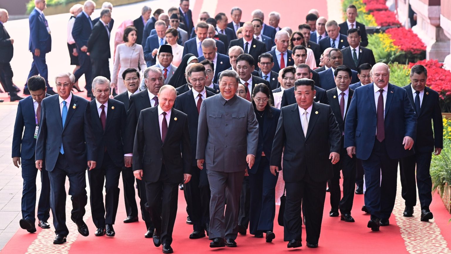 The brief exchange was captured on a live news video feed of Xi and Putin as they walked on a red carpet with North Korean leader Kim Jong Un at the head of a large cluster of high-level guests. The group was going toward the viewing platform for a major Chinese military parade on Wednesday.